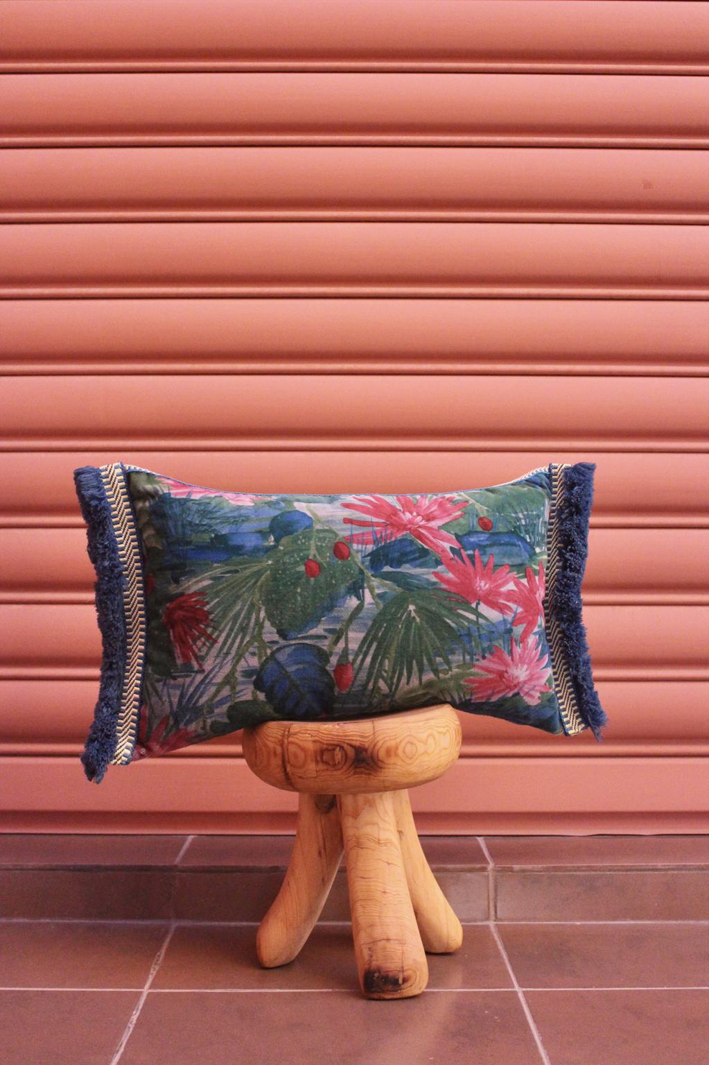 This pillow was made out of a vintage piece of "Mobra" textile. This kind of upholstery fabric with floral designs is and a velvet feel has been used -and still is- in traditional moroccan houses, from the humble home to the most luxurious palaces, to decorate extra large reception living rooms.