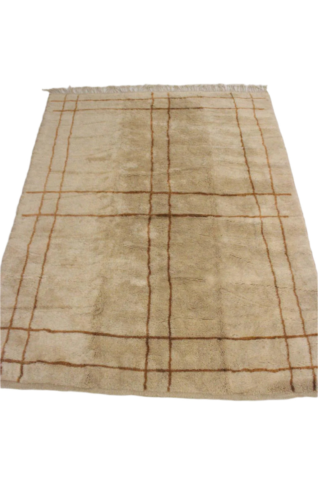 The design is quite simple, with a beige background and light brown lines in a minimalist grid pattern. This is a warm, calm and elegant rug that would look great in an office or a modern living room!