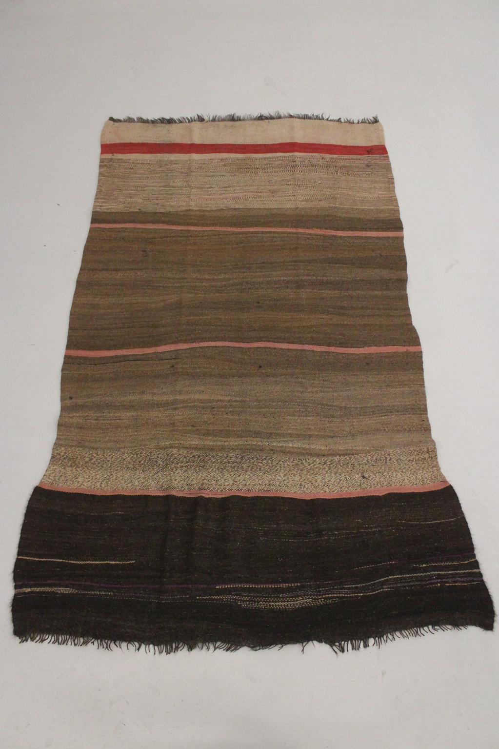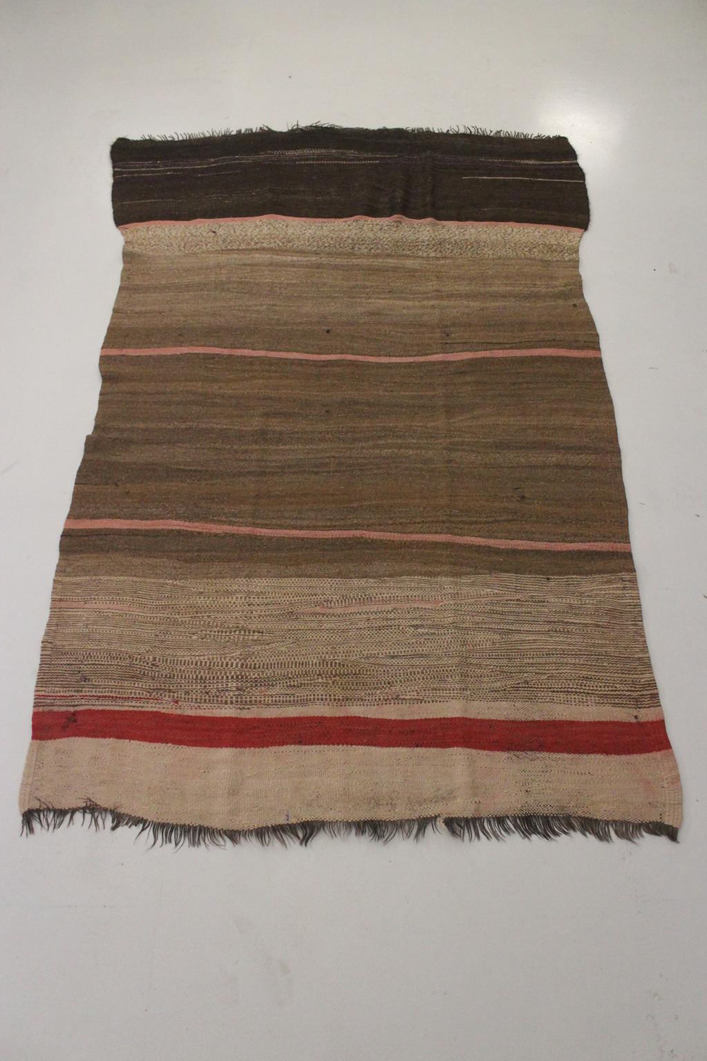 If you are on the market for some flatweave moroccan rug, you probably came accross the ones we call "Zanafi" rugs. Well, this one is the real vintage version of the Zanafi rug, was probably made in the East-Ouarzazate region and comes in an unregluar shape and unusual mix of colors.