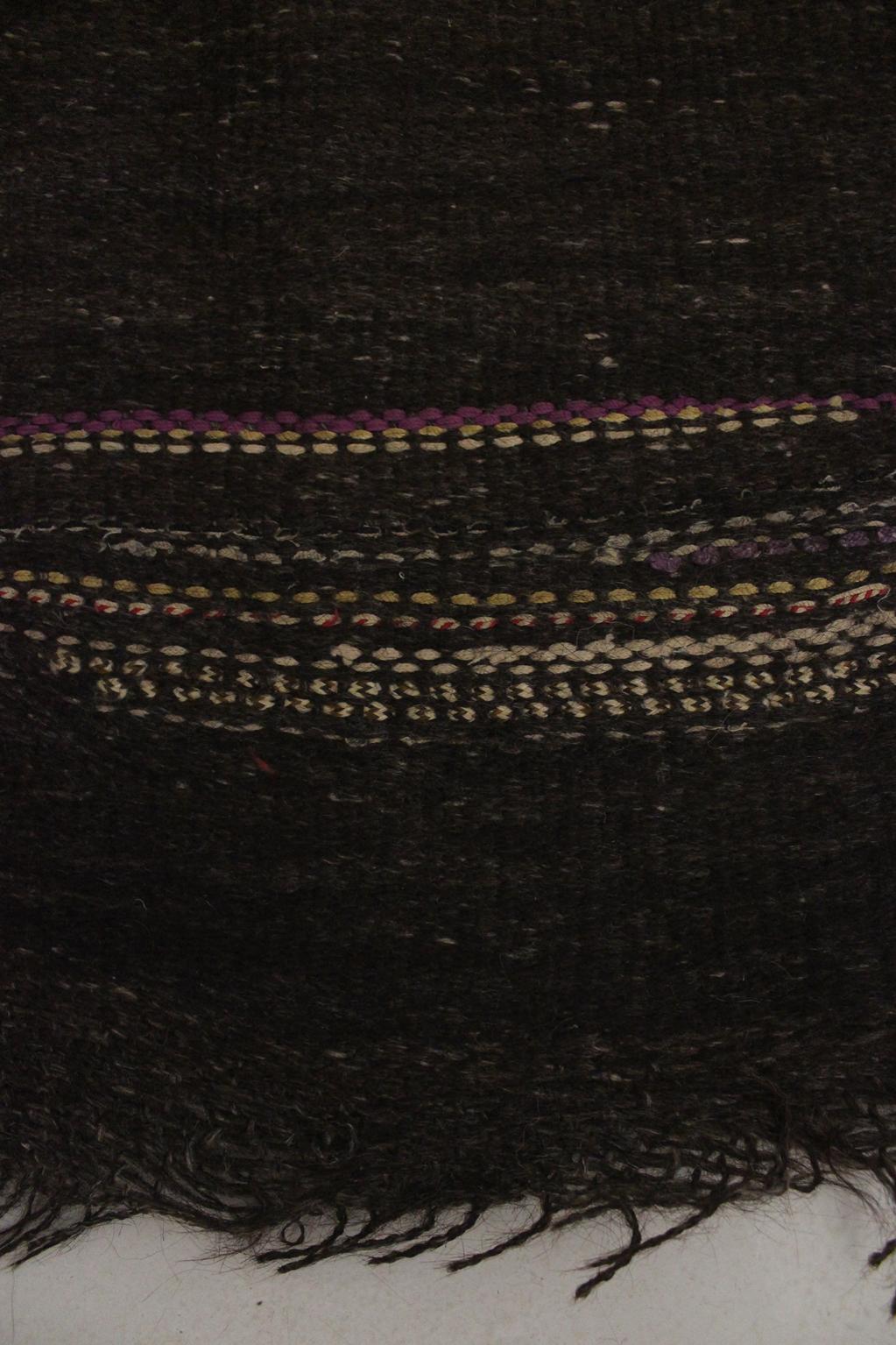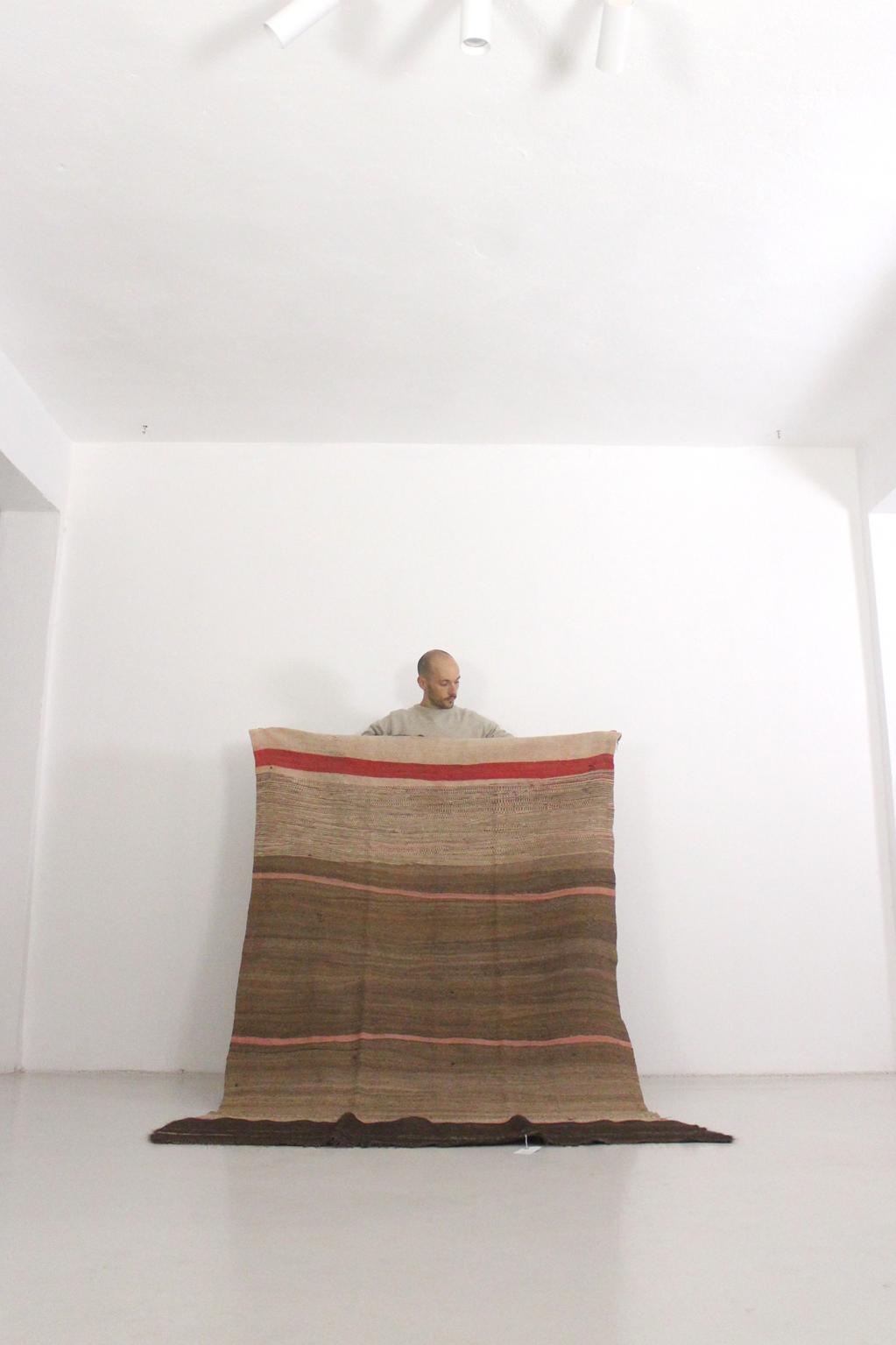 The rug is made out of sheep wool and goat hair (the darkest part and also the base of the whole rug (you can tell from the tiny tassels)). The colors are mostly natural, undyed wool in beige, brown and dark brown, with a sweet addition of pink and red. In the darkest part you will find some purple and colorful strings that subtly pop up. The whole composition of the rug is so lovely and calm!