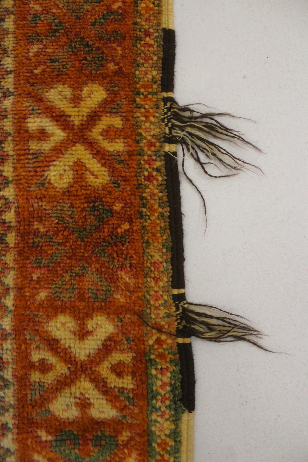 This rug is real vintage, meaning that it was made first for a private use, not directly for the market. It will come with light signs of age. The most obvious thing to notice is a few tiny areas where the color bled a little (see close-up pictures attached). That said, the rug was nicely fixed and is now in a great condition!