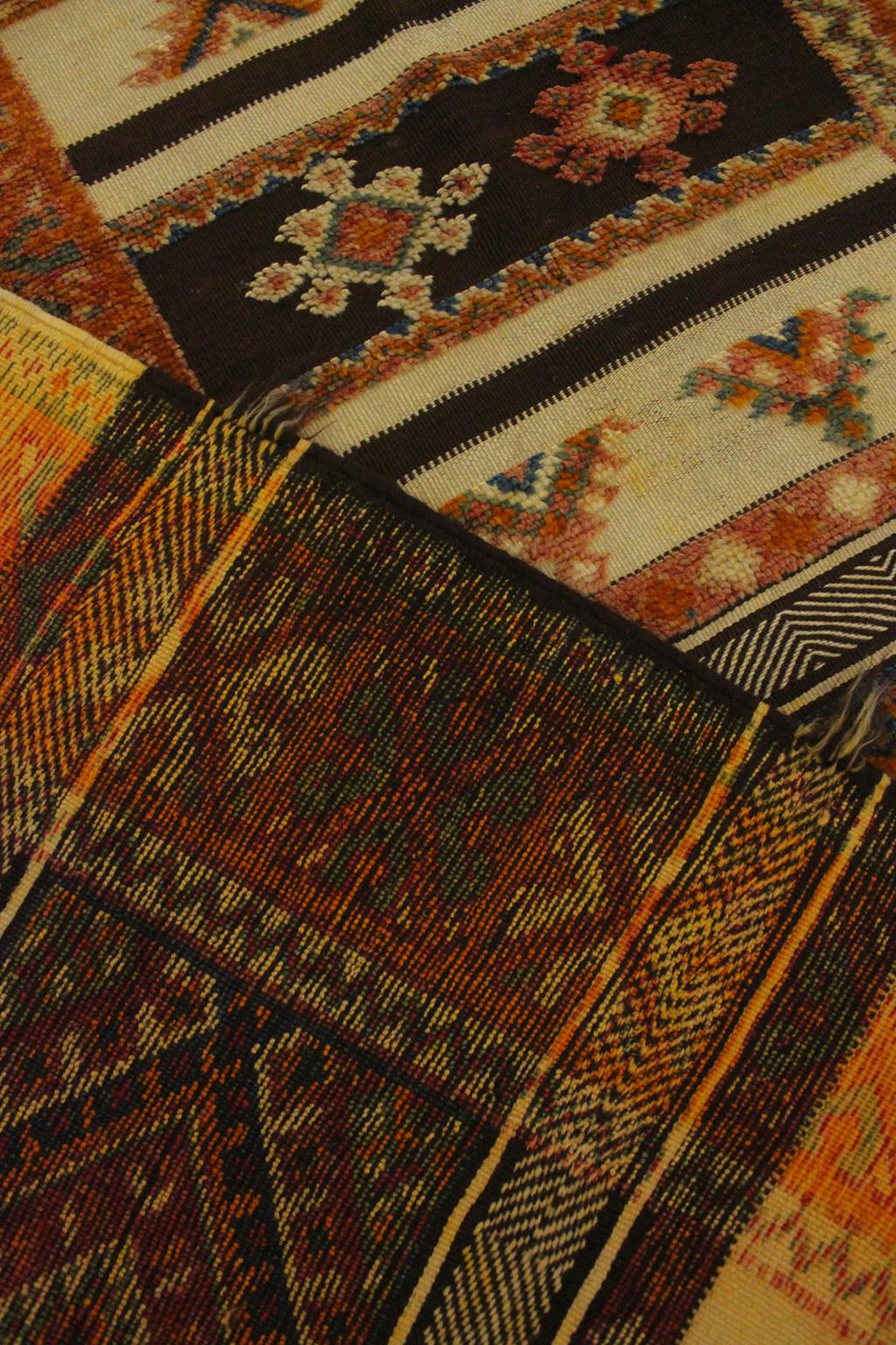 I sourced this beautiful rug during a recent trip to the Souss Massa region in Morocco. These rugs called "Glaoui", from the Glaoua tribe in the High Atlas, are known for showing several techniques in one single piece. The rug is both woven, knotted and embroidered which gives it a great texture: the beige and dark brown parts are flatweave and the colorful strips are a soft, low to medium pile.