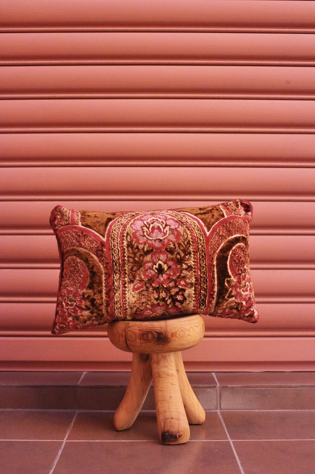 This pillow was made out of a vintage piece of "Mobra" textile. This kind of upholstery fabric with floral designs and a velvet feel has been used -and still is- in traditional moroccan houses, from the humble home to the most luxurious palaces, to decorate extra large reception living rooms.